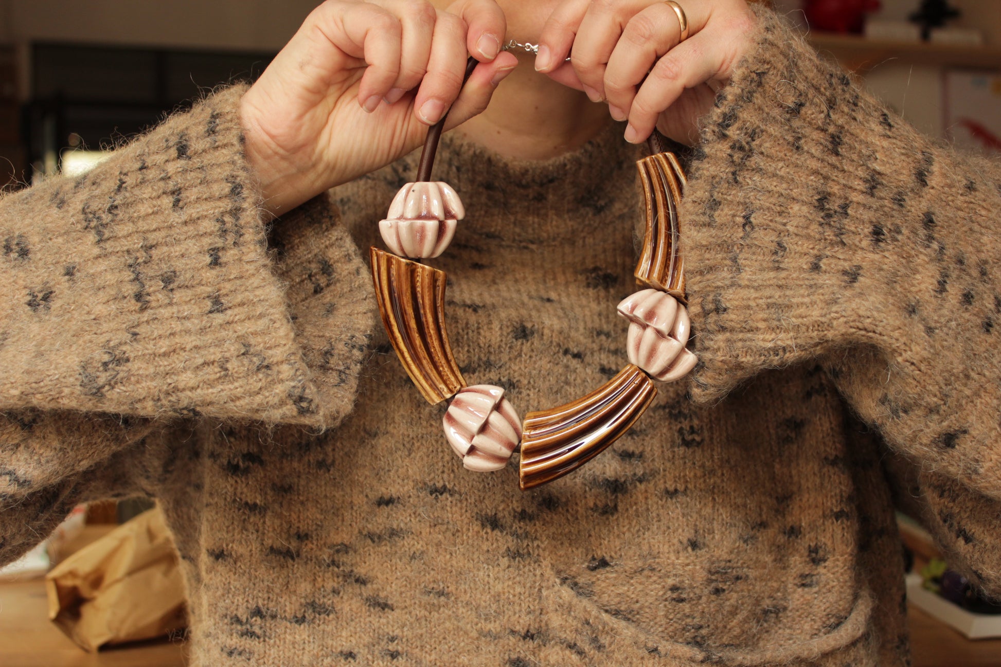 Athena è una collana ispirata alla natura e all’architettura, con un design fluido e organico. Le sue forme, scolpite a mano, sono percorse da profonde scanalature lineari che donano al collier eleganza, movimento e carattere.