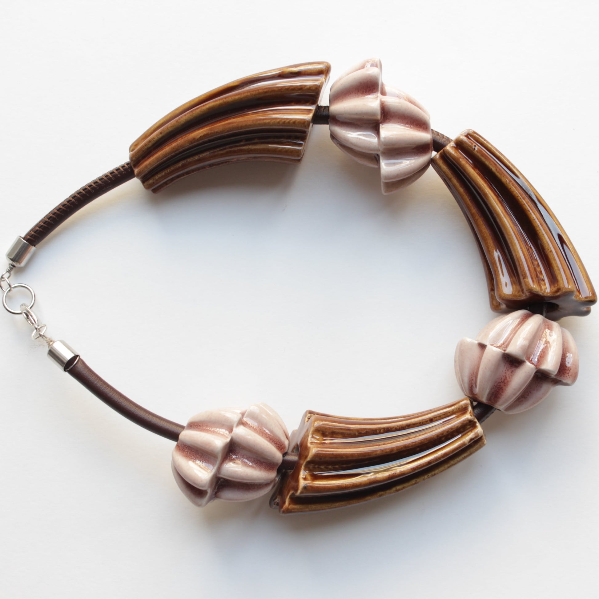 La palette cromatica è calda e naturale, ispirata alla terra, al legno e alla pelle. I toni bruni e rosati si mescolano in modo raffinato, mentre la cristallina colorata rifrange la luce, generando delicati contrasti di chiaroscuro.