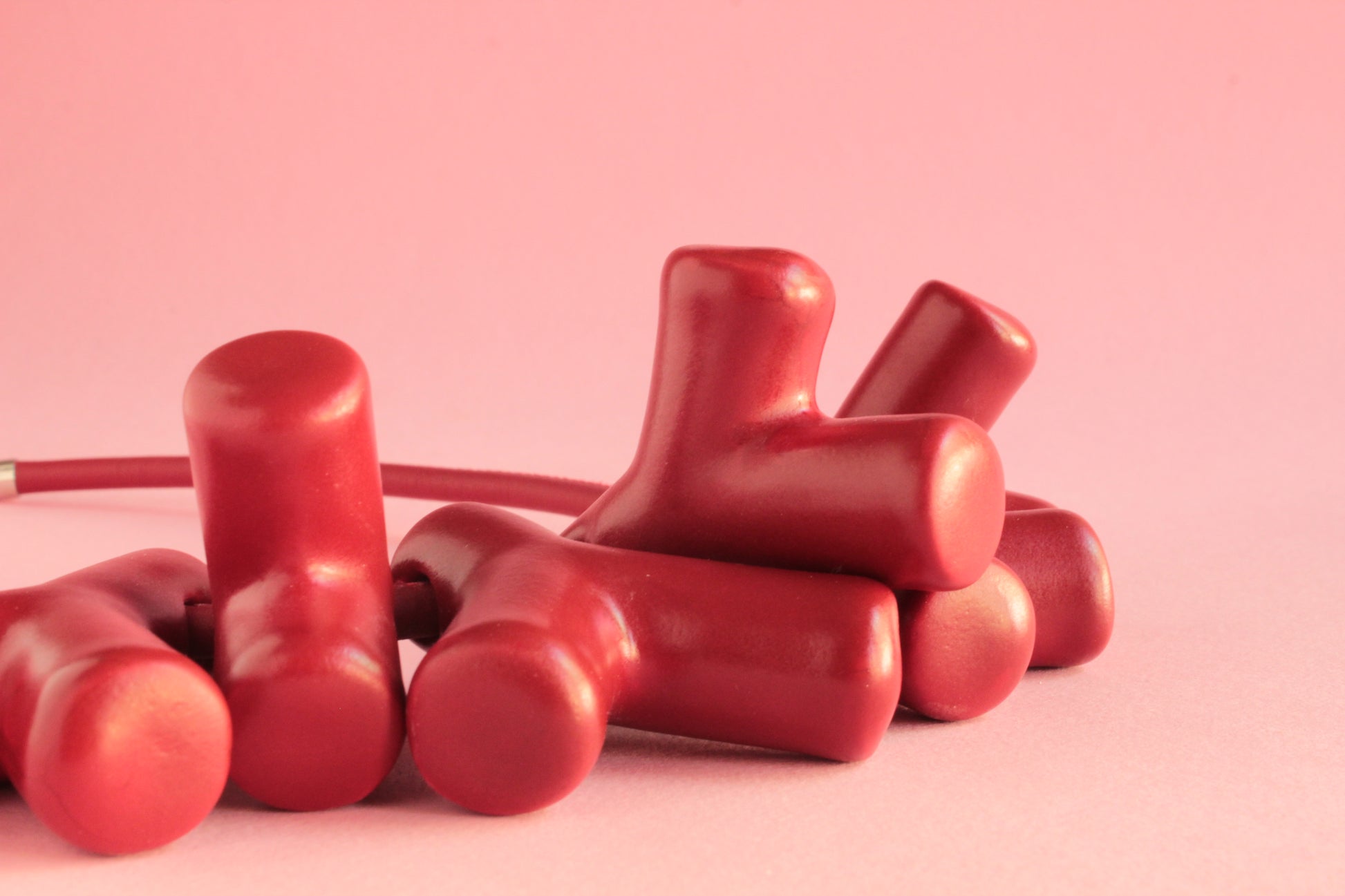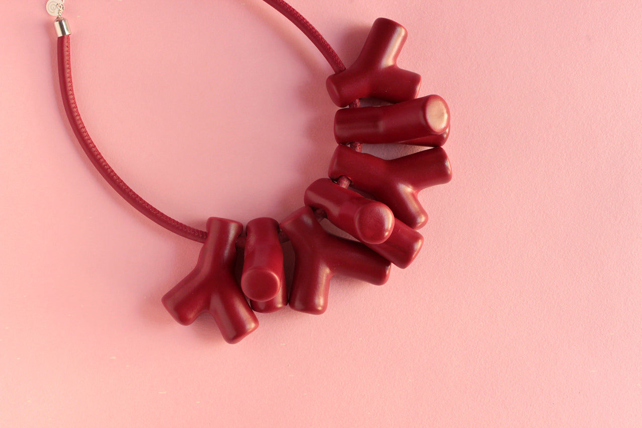 Una collana moderna e decorata con smalto opaco rosso scuro.