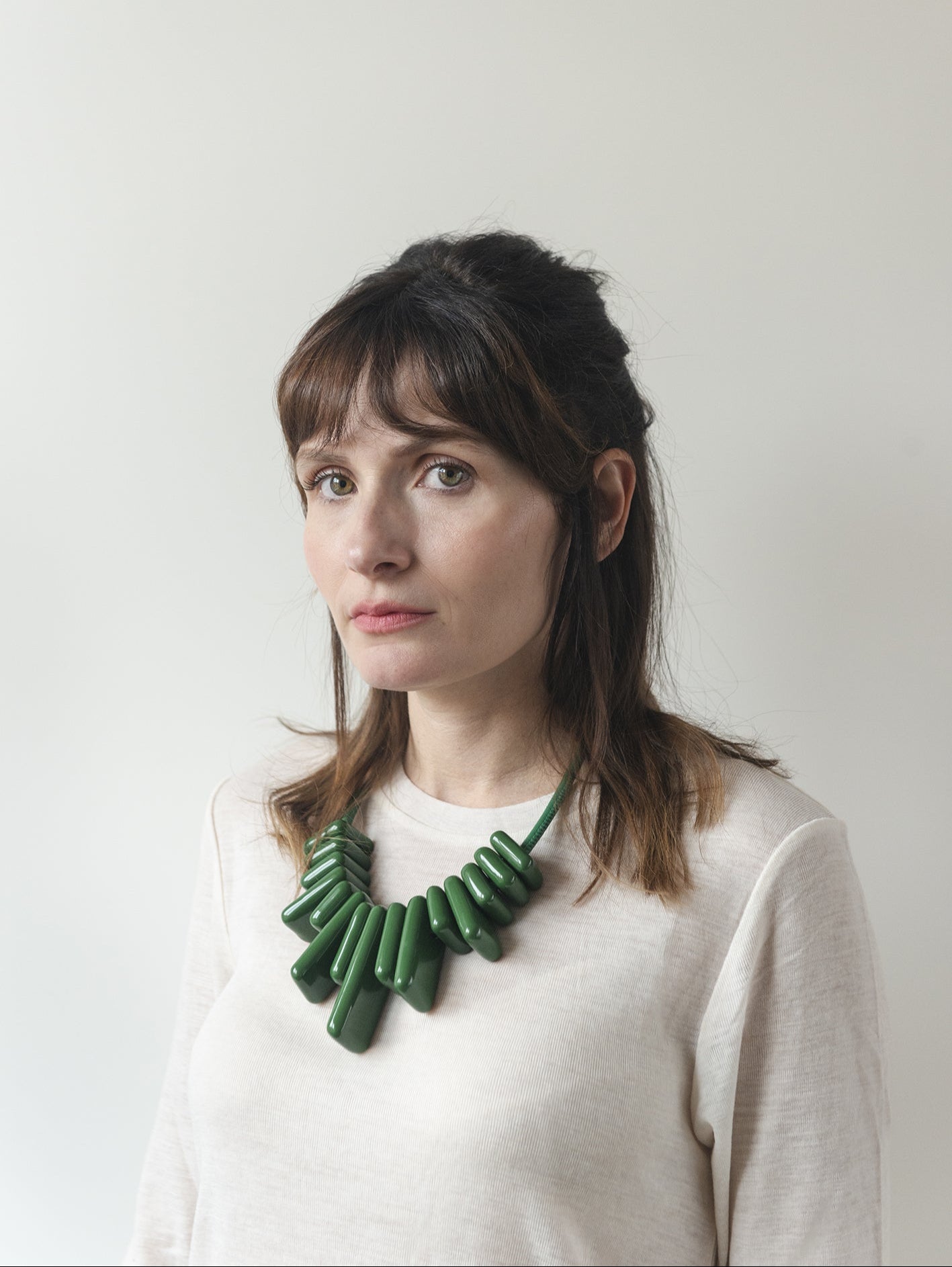 Domino è un grande collier in ceramica smaltata, composto da 15 piastre bold di varie lunghezze, montate su un cavo in pelle tono su tono.