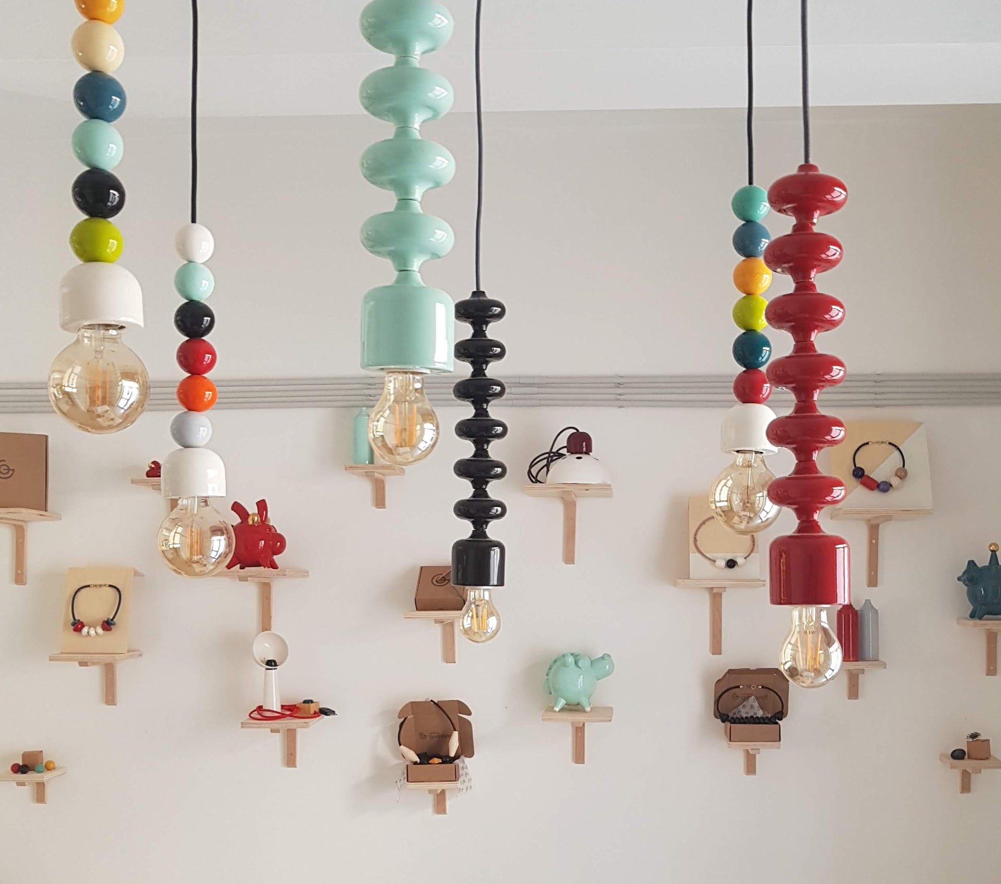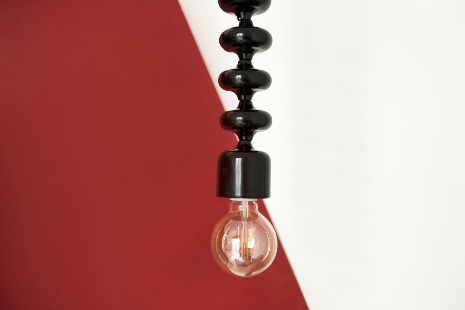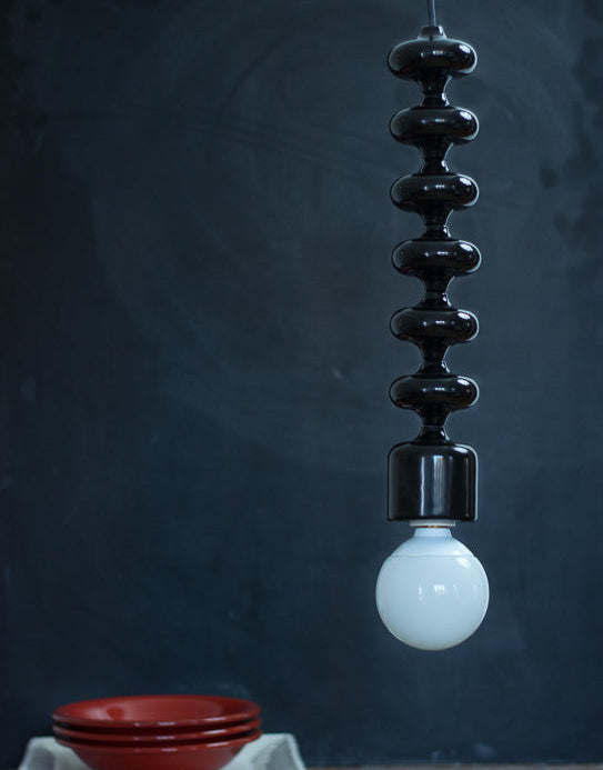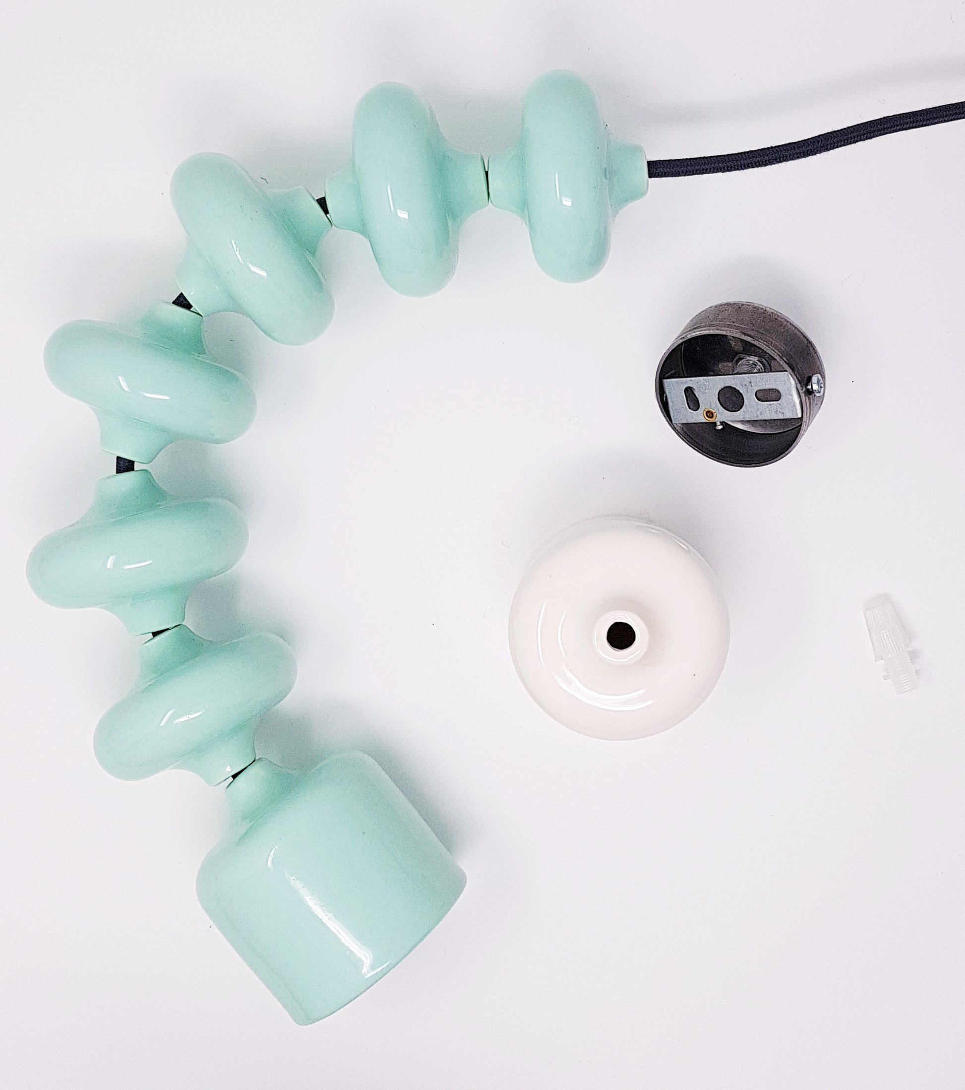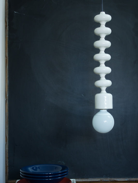 La lampada include una calottina copri-filo in ceramica bianca, realizzata a mano, che nasconde l’attacco al soffitto.