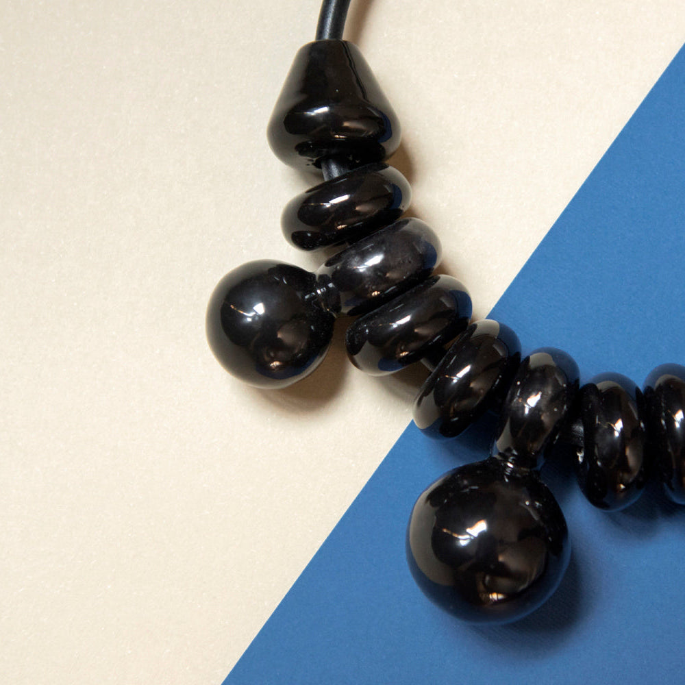 Grande collier in ceramica artigianale, realizzato a mano con elementi modulari dalla forma essenziale e decisa.