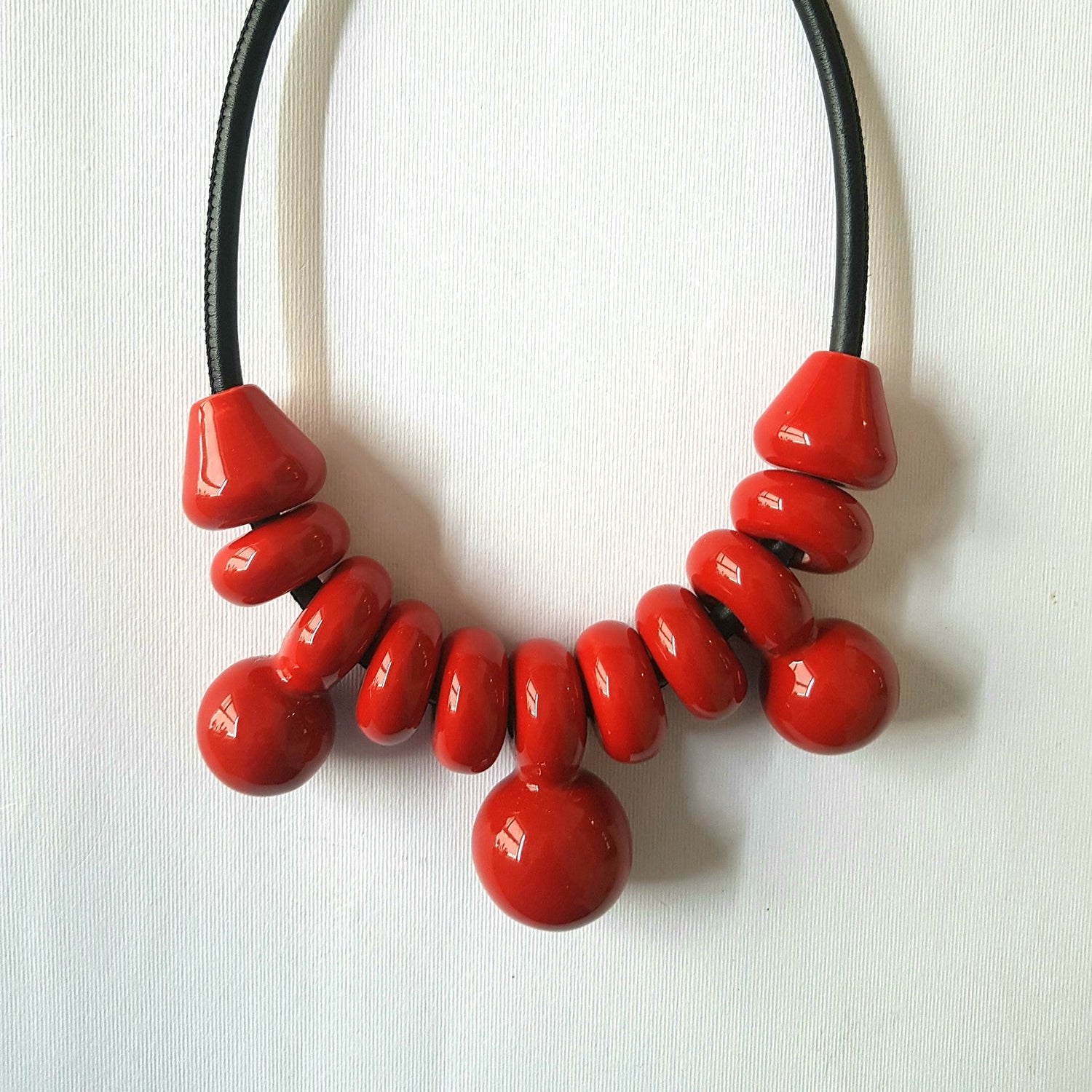 Grande collier in ceramica artigianale, realizzato a mano con elementi modulari dalla forma essenziale e decisa.