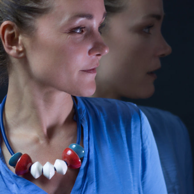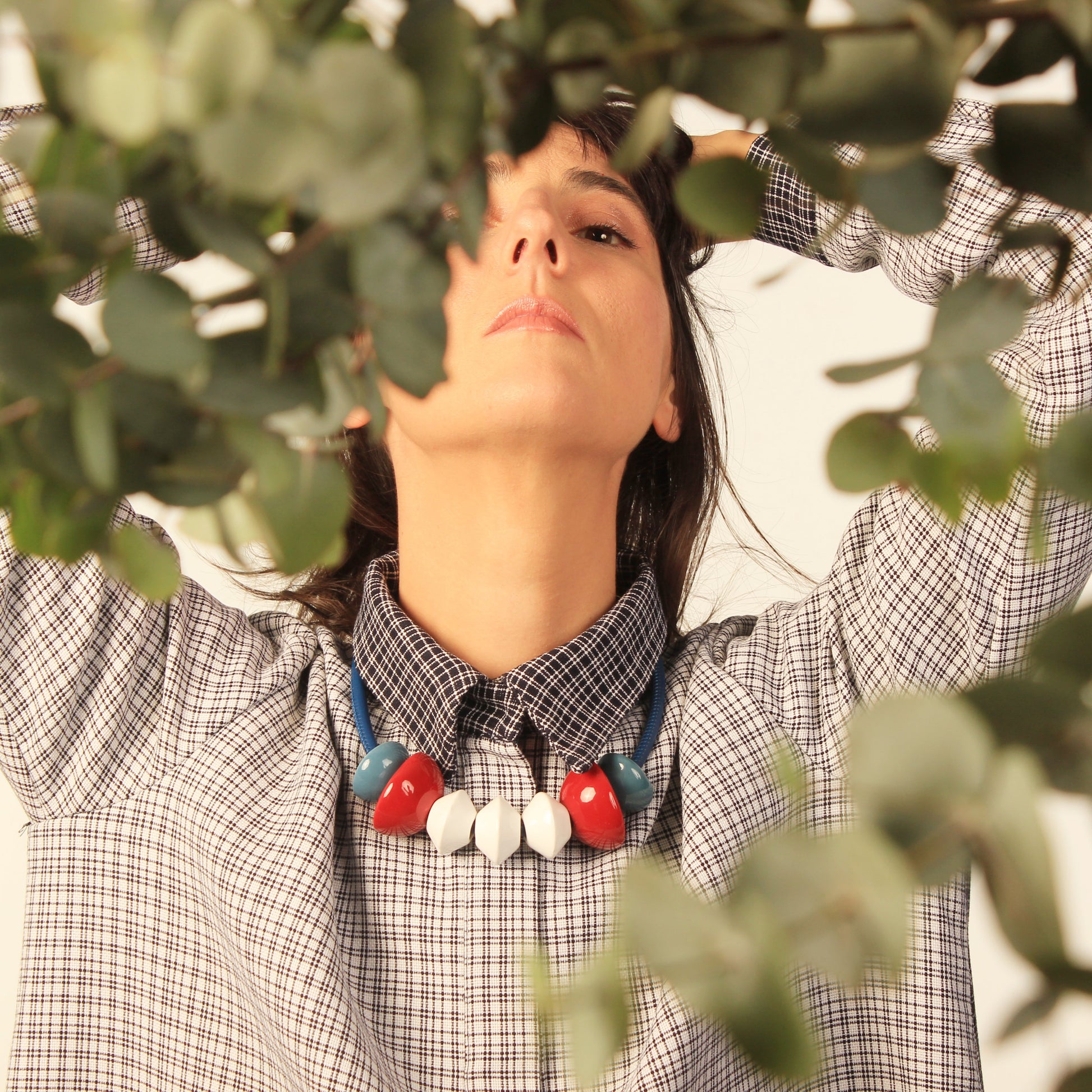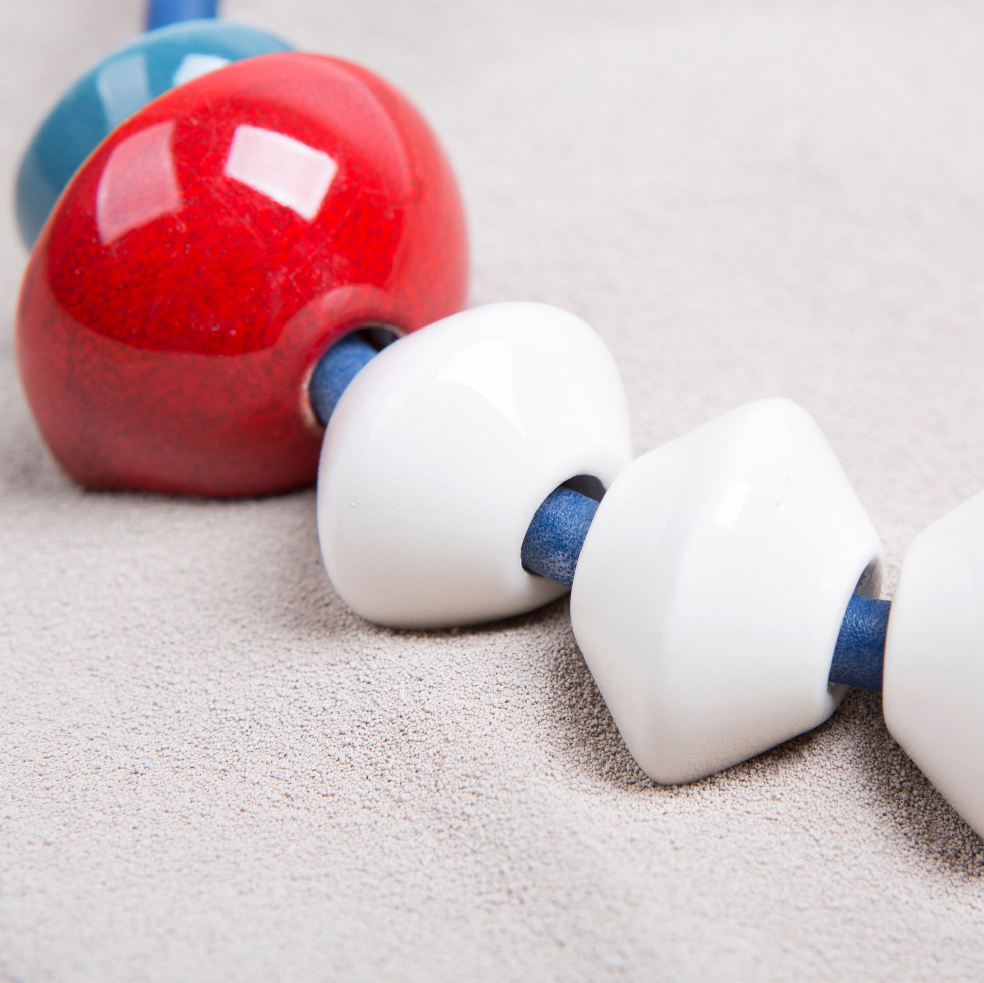 Grande collier artigianale in ceramica, realizzato a mano con elementi modulari disposti simmetricamente. Le forme ruotano e si riflettono intorno a un asse centrale, creando un design geometrico e armonioso.