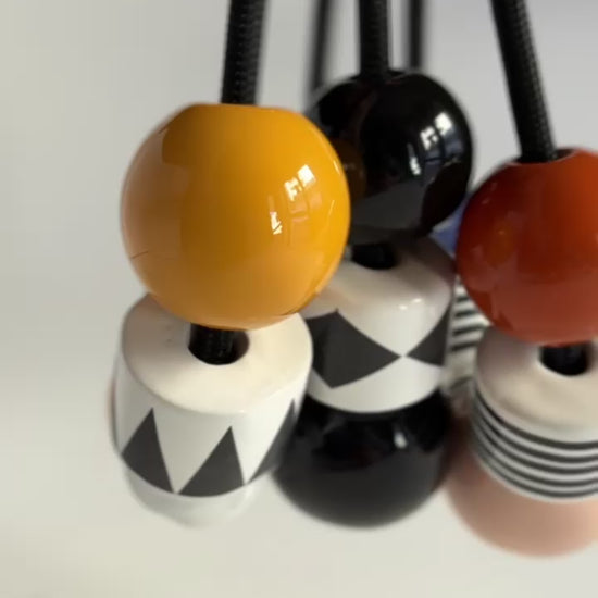 Nella lavorazione abbinano le geometrie in decalcomania con lo smalto degli elementi sferici.